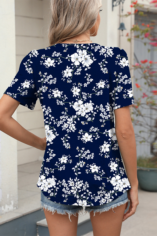 • Design: Relaxed-fit T-shirt, featuring a vibrant floral print with warm yellow, rust, and pink tones. It has a classic crew neck, short sleeves, and a subtle pleated front for a flattering, feminine silhouette.