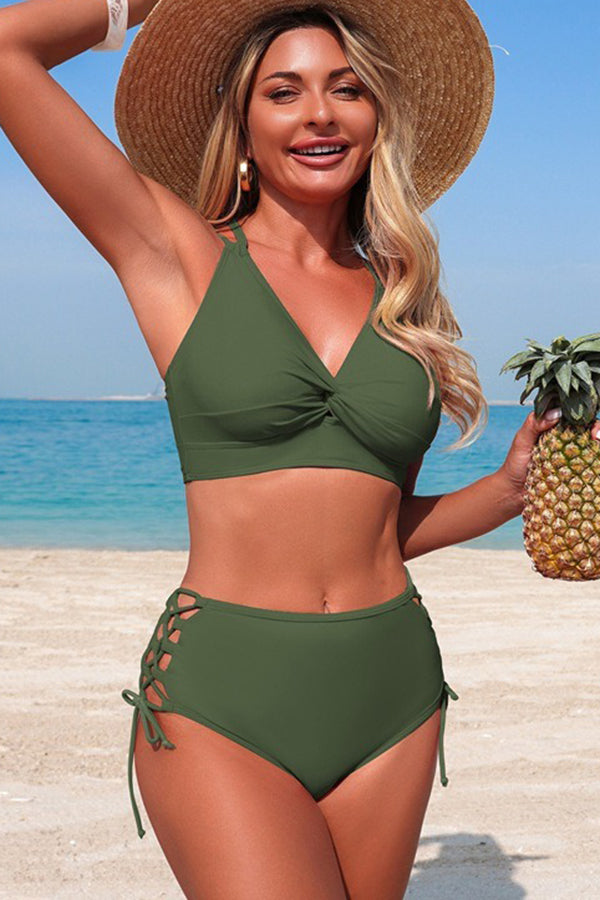 Twist-Front High-Waist Lace Up Bikini Set Army green - Swimwear from Cindelily